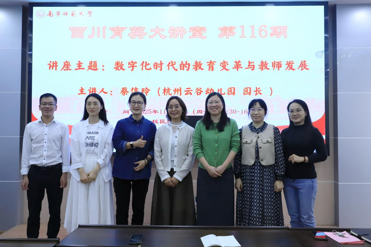 11月15日,为强化师范生人工智能素养培育,深化教师教育领域的研究与交流,由南宁师范大学教育科学学院主办、广西教育现代化与质量监测研究中心承办的《百川育英大讲堂》第116期讲座,在五合校区理综楼1003室顺利举行。本次讲座特邀杭州云谷幼儿园园长蔡伟玲主讲“数字化时代的教育变革与教师发展”,由教育科学学院副院长张瑞教授主持。