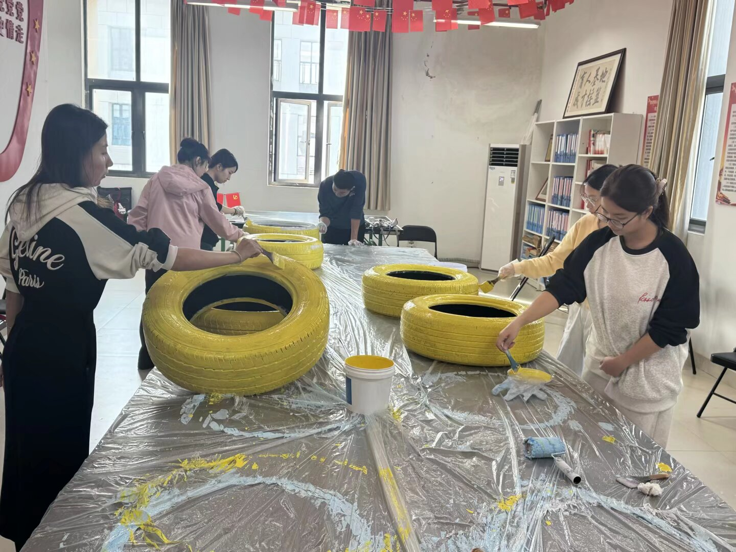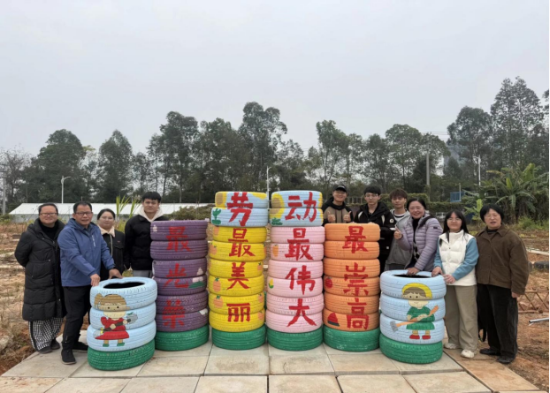 2025年12月,学院率先启动“废旧轮胎创意造型设计”环节,学院党委书记、副书记现场指导或亲自带队,带领辅导员前往广西车船回收公司挑选、搬运废旧轮胎。随后,学院组织各专业志愿者有序开展轮胎清洗。